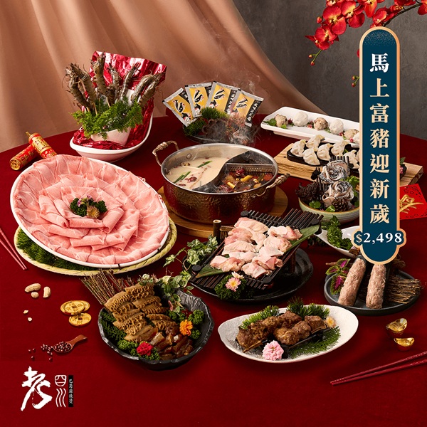 台灣梅花豬肉、西班牙伊比利豬肉各1盒或美國精選五花牛肉、美國精選雪花牛肉各1盒、金鳳報喜吉祥饌(嚴選雞腿肉)、富貴花不完(花枝漿)、龍騰四海(龍膽石斑魚片)、喜事長盈(滷水大腸頭)或福祿滿盈(滷水拼盤) 、昇龍獻寶(鮮甜草蝦)、蜀香排骨酥(蜀香排骨酥)、團圓滿福拼(椒香海鮮丸/芋香貢丸)、海派金招寶(海鮮熟水餃)、風味芝麻沾醬,約4人份可用